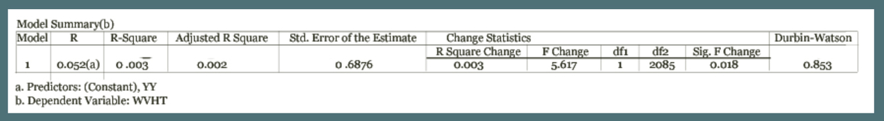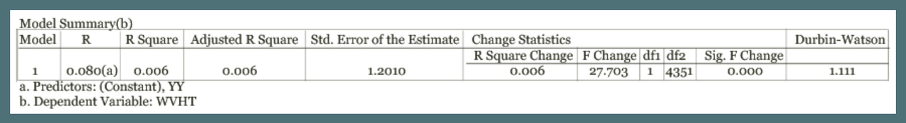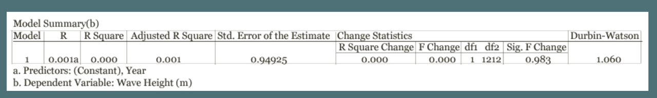 A regression analysis of wave heights of nor’easters over time was performed using SPSS. The model summary and ANOVA test show that there is a highly significant trend in the data (significance value of 0.000). The regression line indicates a slight decrease in the wave heights of nor’easters over time, suggesting again an overall decrease in the intensity of the nor’easters in the New Hampshire area.