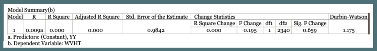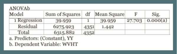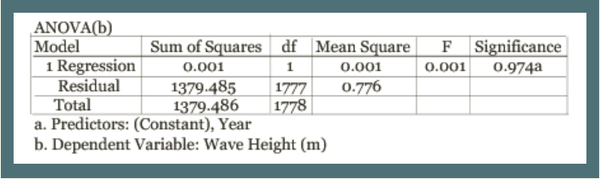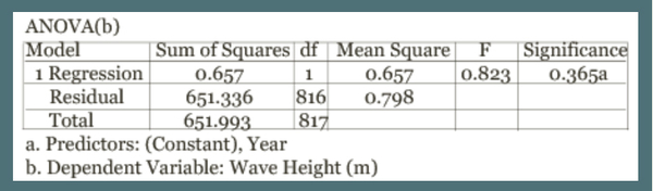 This regression was created using the Statistical Package for the Social Sciences (SPSS). These analyses looked at the wave heights of storms during the hurricane season over time in Florida. The model summary and ANOVA test show that there is no significant trend in the data (significance value of 0.365).