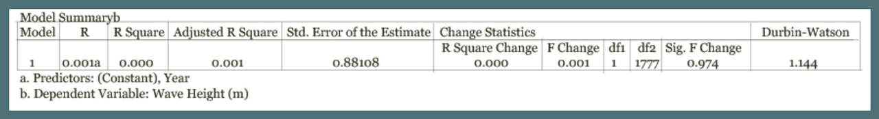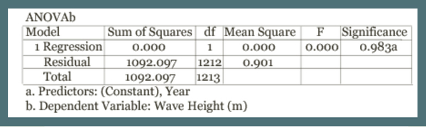 A regression analysis using SPSS looked at the wave heights of nor’easters over time in North Carolina. The model summary and ANOVA test show that there is no significant trend in the data (significance value of 0.659), and the regression line shows no clear trend in the data. If the data set were expanded to include more years, a significant trend might be found.