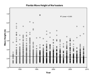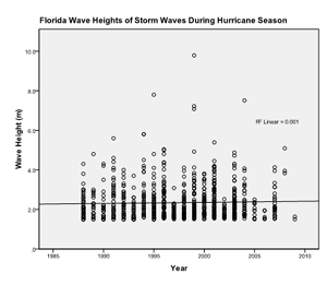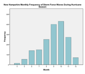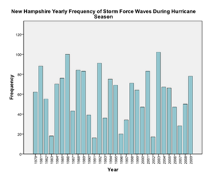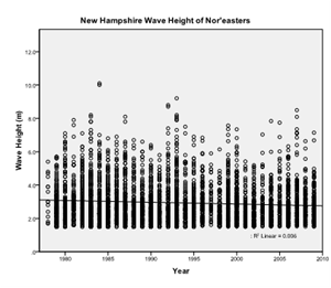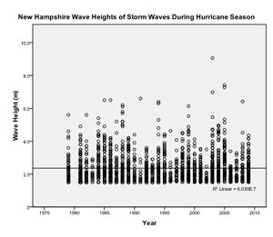 To study wave heights of storms during the hurricane season over time, a regression analysis using SPSS was performed. This analysis indicates no trend in the data (significance value of 0.974). As with the North Carolina data, there was too much variability in the New Hampshire data for there to be a significant trend.