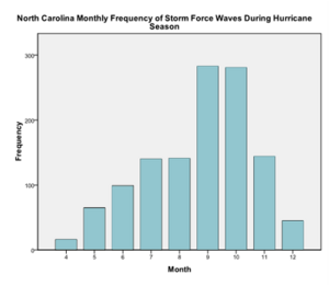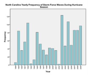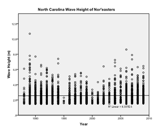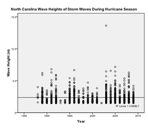 The regression, found using SPSS, shows no trend in the data when analyzing the wave heights of storms during the hurricane season over time (significance value of 0.983). There was too much variability in the North Carolina data for there to be a significant trend.