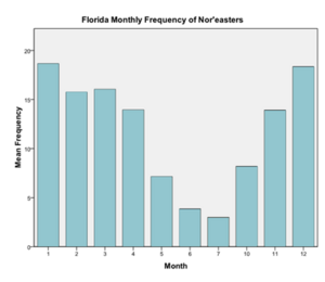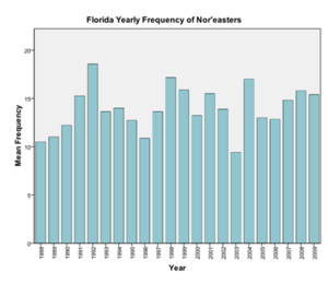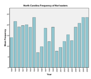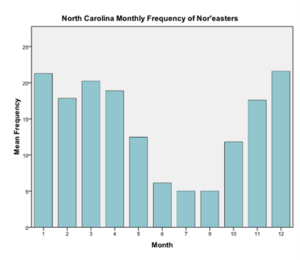 The data set for North Carolina, spanning from 1988 to 2009, was used to study the mid-Atlantic Coast. Once again, the monthly frequency data shows the seasonality of nor’easters explained earlier. There is no one month that has a drastically higher frequency than any other months. However the yearly data shows different results than the data from Florida. The years of 1994, 2008, and 2009 saw very high frequencies of nor’easters, while there was a period between those years with relatively low frequencies, with the exception of 1997 and 1999. The year 1995 had the lowest frequency of nor’easters.