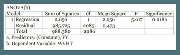 This regression was created using the Statistical Package for the Social Sciences (SPSS). These analyses looked at the wave heights of nor’easters over time. The model summary and ANOVA test show that there is a significant trend in the data (significance value of 0.018), and the regression line shows an overall decrease in the wave height of the storms, suggesting a weakening of the overall strength of nor’easters in Florida.