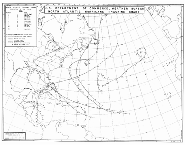 The best tracks of hurricanes during the 1926 season including the great Miami Hurricane originating at the bottom of the frame.