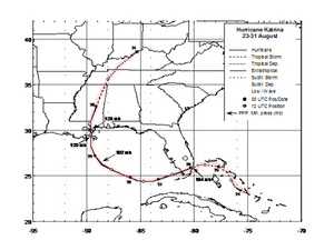 Hurricane Katrina began as a tropical depression near Nassau on August 23, forming from the remnants of Tropical Depression #10 as they interacted with a tropical wave and an upper-level trough. Moving through the Bahamas, Katrina became a hurricane on August 25th, just two hours before making landfall at 2230 UTC, August 25th, near the Miami-Dade County and Broward County border. After developing an eye during its 6 hour long trek across the Florida Peninsula, it weakened to a tropical storm emerging from Florida in the early morning of August 26th. Upon entering the Gulf of Mexico, Katrina began a period of deep intensification developing into a category 5 hurricane by August 28th with a maximum intensity of 150 knot winds and a wind field spanning 200 nautical miles from its center. This, in part, was generated by a surprise warm-core eddy situated along the hurricane’s path which gave extra fuel to the growing monster. Turning North, Hurricane Katrina experienced a rapid period of deterioration, dropping to a category 3 before making landfall near Buras, Louisiana at 1110 UTC, August 29th. Quickly weakening as it passed over land, Katrina was still able to churn up over 33 tornadoes as it turned across the Tennessee Valley, dissipating by August 31st. The damage from Hurricane Katrina was widespread with many catastrophic failures across the southern coastal states. Levees along the Mississippi River protecting New Orleans suffered catastrophic failures which lead to the now infamous flooding of the city and millions were left without basic utilities. Among the environmental impacts were oil rigs washing up on shore and the restructuring of much of the Mississippi delta due to this powerful storm. Hurricane Katrina ended up costing over 1800 lives and $81 billion in damages across America. (information courtesy of NOAA)