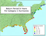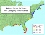 The Saffir-Simpson hurricane intensity scale was developed in the 1970’s by Herbert Saffir and Robert Simpson (Williams, 2005). It breaks hurricanes into 5 categories, grouped by the maximum sustained wind speeds, which are the peak winds over a period of 1 minute at a height of 10 meters above the surface. From these measured speeds, theoretical ranges for minimum central pressures and storm surges are calculated.