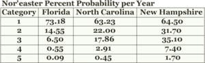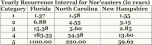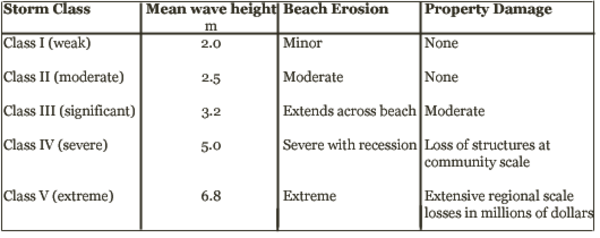 These storms don’t typically receive as much attention as hurricanes, yet quite often can be more devastating. The scale is based on mean wave height caused by the Nor’easter – different from the Saffir-Simpson classification of hurricanes based on wind speed. The scale was developed using data from 1,347 Nor’easters over a forty year time frame. Robert Dolan and Robert Davis developed the scale to classify Nor’easters from Class I through Class V. The table below summarizes each class of storm.