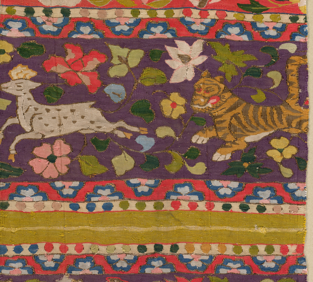 Featured Object: Kesi! Tapestry weaving with such fine materials is next-level. A tiger chases a deer through an enchanted forest, on both sides of the fabric, all made of silk and gold. This is only a detail of a longer piece; colleagues in Cleveland suggest it was made as yardage for clothing but ended up used as a cover for leaves of text. It was probably made in China (though it is not entirely clearly where), and the motifs are selected from a number of sources, by artists who were clearly having a ball.