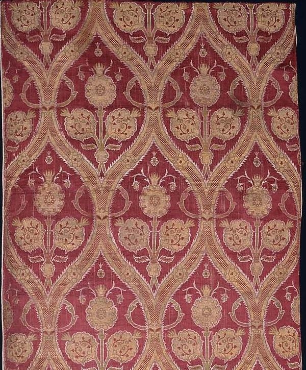 Featured Object. A length of silk textile, in the lampas structure, which combines a satin ground with a twill. In this case, the (warp-faced) satin is crimson and the (weft-faced) twill is gold and green. Many textiles from the Ottoman Empire use a particular type of metal thread know was kılabdan (or kılaptan, etc), made by artisans in workshops attache to the imperial mints -- meant to ensure the close control of precious metal. The workers twisted metal foil around a silk core to make this thread. Yellow silk was combined with silver-gilt, white silk was combined with silver -- to give stronger impressions of gold and silver. In the motif, some people see seed-pods, others see pomegranates and leaves.