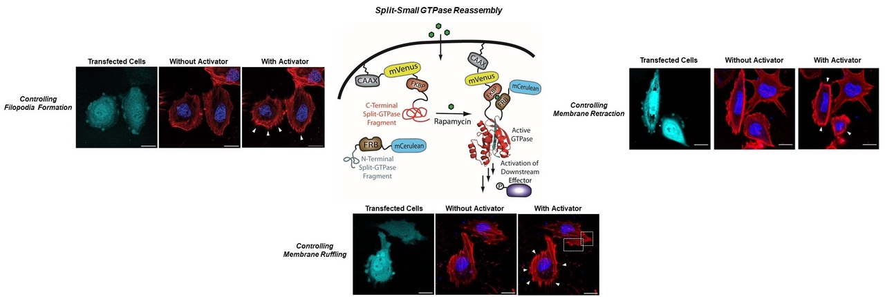 Split-Small GTPases: The development of standardized parts for controlling signaling pathways could allow new functions to be engineered into living systems as well as enable fundamental studies of cellular signaling pathways. To realize these goals, new approaches to controlling protein function are needed. Our laboratory is utilizing split-protein reassembly to develop a lexicon of split-small GTPases to control a diverse array of cellular functions. These tools are being used to dissect signaling pathways involved in human disease.