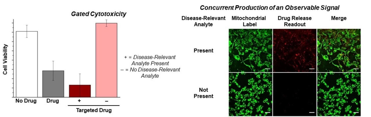 Disease processes result in altered cellular biochemistry. Often, new analytes are produced in diseased cells and provide a potential marker for targeting cytotoxic compounds. Using activity-based sensing approaches, we are engineering functional molecules that can sense the altered biochemistry of diseased cells and release cytotoxic compounds. Concurrent production of a NIR dye provides the ability to assess the amount of compound delivered to target cells and visualization of potential off-target sites.