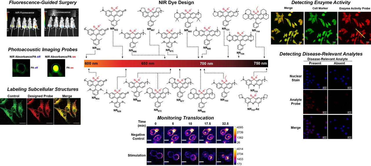 Near-infrared (NIR) light can penetrate into living organisms and dyes that absorb within this wavelength range can provide spatially resolved, real-time information. Our laboratory is interested in expanding the palette and chemical diversity of NIR dyes to improve their properties. Towards this goal, we have developed new NIR dyes that display remarkable brightness and photostability. These scaffolds are being used to develop reagents for fluorescence-guided surgery, deep tissue imaging, and molecular imaging.