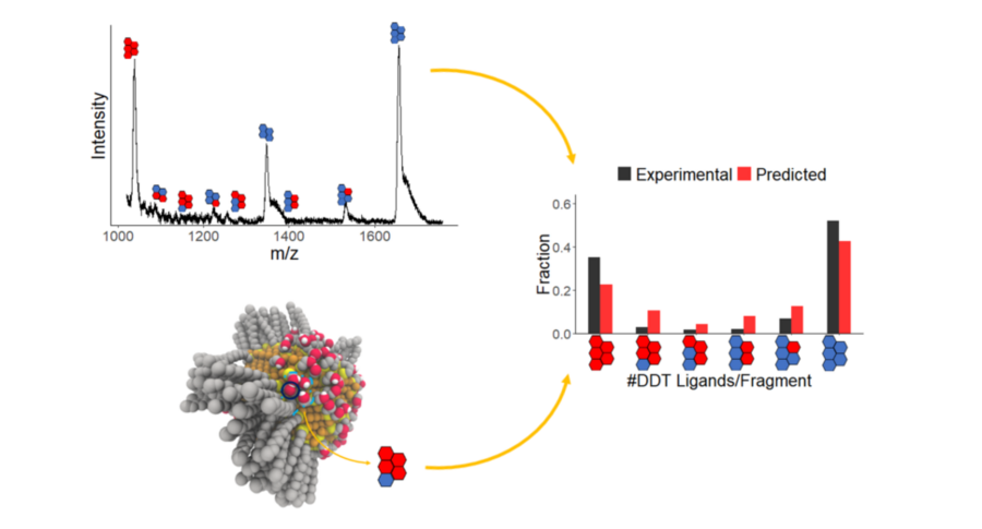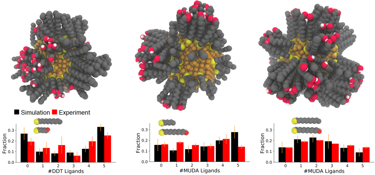 Key Findings: The Green group synthesized silver NPs with SAMs consisting of dodecanethiol (DDT) and mercaptoethanol (ME) at varying ratios and analyzed them using MALDI-MS. The results suggested that DDT and ME phase separated on the NP surface. We then employed atomistic MC simulations to generate equilibrated SAM morphologies. To quantitatively compare the computational and experimental results, we developed a method to calculate expected MALDI-MS spectra from the resulting atomistic models. The simulations agreed quantitatively with the experiments, both indicating that the DDT/ME ligands undergo phase separation in the SAMs, resulting in large, patchy Janus-like domains (Merz, ACS Nano, 2018). We then applied the same MC approach to successfully predict MALDI-MS results for three new ligand combinations, which were chosen to test the ability to separately tune SAM morphology and chemical functionality. The resulting morphologies ranged from randomly-mixed to Janus-like, demonstrating that chain-length modifications are an effective way to tune SAM morphology without needing to alter chemical functionality. Our results also provided atomistic detail of the SAM structures, such as patch sizes and co-crystallization patterns (Merz, Soft Matter, 2019).