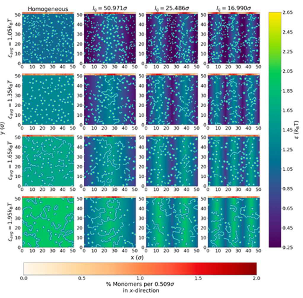 Figure 2: Visualization of the System with Homogenous and Spatially Variant Interactions. Spatially dependent attraction strengths, shown by a color gradient according to the right-hand color bar, influence where specific structures assemble. The homogeneous system (Column 1) results in assembly broadly occurring throughout the simulation box, with structures changing from small aggregates to capsids to long snake-like aggregates as attractions become stronger (more green in coloring). If attractions depend on position (Columns 2-4), when εavg is weak, the regions of strong attraction strength (light blue) form capsids and small aggregates and regions of weak attraction strength (deep violet) remain as monomers. As εavg increases, regions of strong attraction strength become so strong that long snake-like aggregates assemble (green) and the weaker regions are strong enough to promote capsid formation (blue). Decreasing the spatial extent of the gradient, lg, further controls where different structures assemble. Above each snapshot is a bar indicting the average percent of monomers within the system, suggesting more monomers are localized near regions of strong attraction strength.