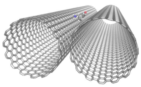Figure 1: Simulated Carbon Nanotubes with Adsorbed Dopamine. Dopamine diffuses into and remains in the exterior groove formed by two solvated and parallel (15,15)-carbon nanotubes, enhancing diffusivity along the carbon nanotube axis. The solvating water molecules were omitted for visual clarity (Jia, Molecules, 2022).