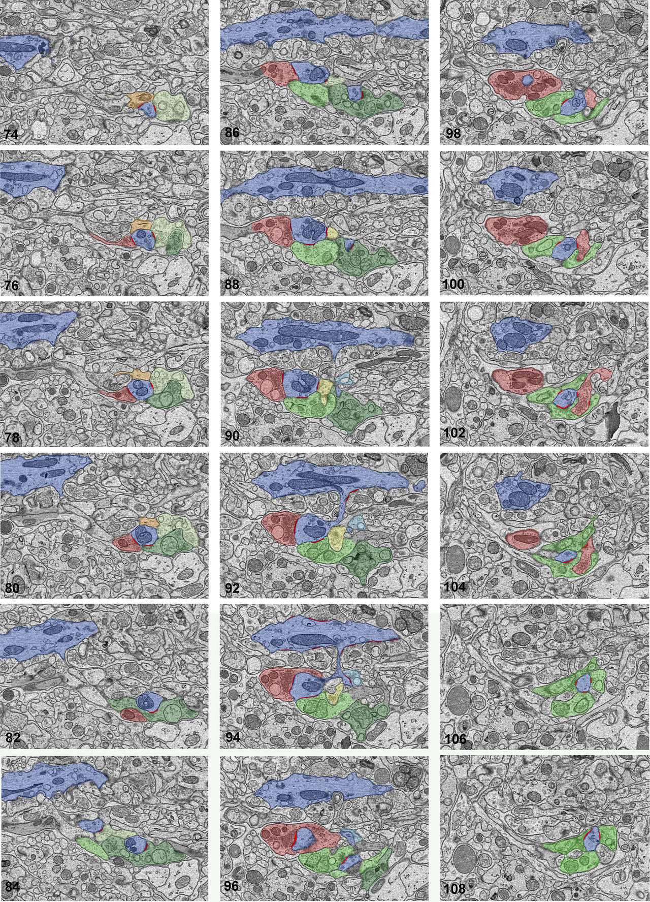 A series of SBEM images displaying a relay dendrite segment that gives off a grape-like appendage. The series represents a 2.5 micron thickness of the tissue. Every second image in the sequence, numbered 74 to 108, is organized in successive columns. The cross-sections of a relay cell dendrite are traced and pseudocolored blue. This dendrite gives off a thin stalk (around section 90), subsequently giving off three large swellings (or grapes). Each grape receives synapses from multiple boutons. For example, the grape in section 90 receives three synapses (red lines): one from a retinal terminal (pseudocolored light green), a second one from a large, dark mitochondria-containing, presumed inhibitory cell terminal (red), and a third one from a small-sized bouton that does not contain mitochondria. The latter bouton was classified as presumed brainstem origin. The second grape, visible in sections 74 to 88, receives synapses from 4 boutons: two retinal terminals (light and dark green), and two medium-sized, presumed inhibitory terminals (orange and red). A third grape in sections 96 to 108 receives synapses from 3 retinal terminals (all light green) and one inhibitory bouton (red). Notice that this red bouton also receives synapses from two of these retinal boutons (in sections 102 and 104), thereby forming a complex triad involving the grape. Because the red bouton is both presynaptic and postsynaptic, it is classified as an F2 bouton, the dendritic appendage of a geniculate interneuron.
