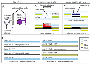 Ouyang Y, Wang S, Li J, Riehl PS, Begley M, Landers JP. 2013. Rapid patterning of 'tunable' hydrophobic valves on disposable microchips by laser printer lithography. Lab Chip. 13(9):1762-71.