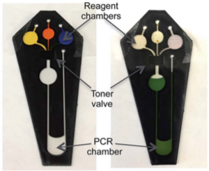 Brandon L. Thompson, Christopher Birch, Jingyi Li, Jacquelyn A. DuVall, Delphine Le Roux, Daniel A. Nelson, AnChi Tsuei, Daniel L. Mills, Shannon T. Krauss, Brian E. Root and Landers, JP. 2016. Microfluidic Enzymatic DNA Extraction on a Hybrid Polyester-Toner-PMMA Device. Analyst. 141:4667-4675. doi 10.1039/C6AN00209A