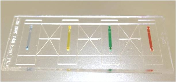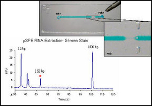 Messenger RNA expression analysis requires isolation of RNA from biological samples, followed by reverse transcription-PCR (RT-PCR) amplification and separation of target amplicon to identify the sample. The method is based on the inherently variable mRNA expression from different cell types, producing gene-specific patterns which can be verified by the presence of a unique mRNA expression patterns.Recently, Juusola et al. 1 described a method using mRNA expression to identify specific body fluids. To obtain mRNA for the transcription and amplification necessary for gene expression analysis, RNA must first be isolated and purified from the biological source of interest. Consequently, a robust system for purification of RNA will be essential as the development of messenger RNA expression analysis methods unfold. A closed microfluidic, silica-based purification system would represent a significant improvement to current methodologies for RNA extraction, which often involve time- and reagent-consuming organic extractions, by decreasing the opportunity for introduction of contaminants and RNases, as well as reducing the amount of sample, reagents, and time required to perform this delicate isolation. The application of a silica-based microchip solid-phase extraction method for purification of RNA as a precursor to mRNA profiling would be also be a promising step toward simultaneous DNA and RNA purification technology, permitting a more comprehensive genetic analysis from a single source. In addition, development of a single-process RNA purification device represents the first step towards creation of an integrated micro-total analysis system [μ-TAS] capable of total mRNA profiling, Work with silica and alternative phases to silica for extraction of RNA is underway for use in genetic analysis as well as clinical diagnostics.