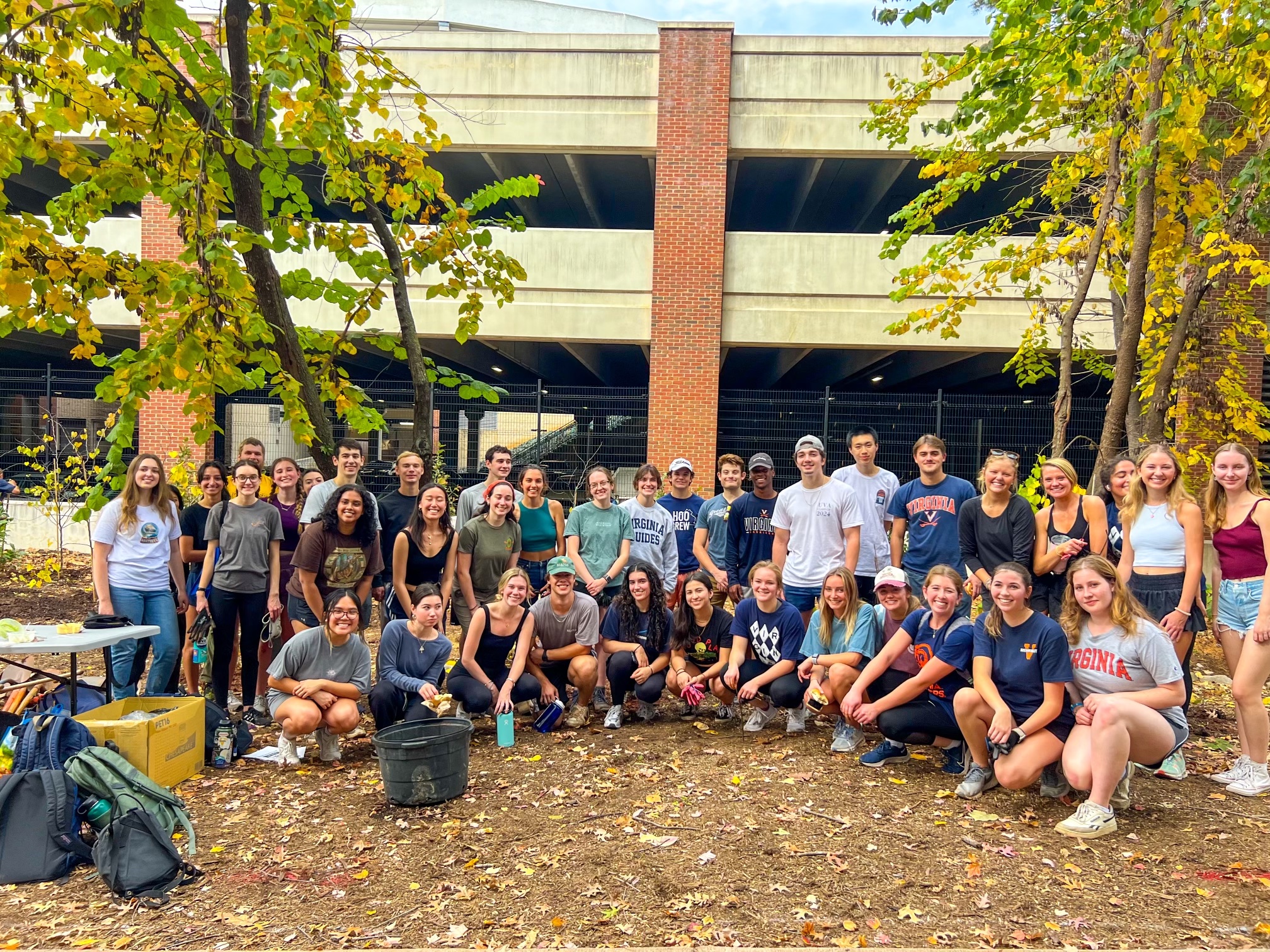 On October 27, 2023, NWG members helped the Forest Patches at UVA research team plant a forest patch on Grounds, by Scott Stadium. A forest patch is defined as “a place where forest vegetation is spontaneously regenerating and predominately self-organizing, located in a matrix of urban land uses, such as the built environment.” The forest patch is located by the parking garage at Scott Stadium, and all species planted are native to the area, including Black Tupelo, Red Bud, Yellow Buckeye, Rhododendron, and Beebalm. Forest patches are well known for being a natural carbon sequestration tool, but they also serve as a storage mechanism for reactive nitrogen. Plants primarily take up nitrogen in the form of nitrate and ammonium as nutrients. The nitrogen is then stored in plants as amino acids and protein. The team found existing forest patches on Grounds to be sequestering ~13,000 MT of carbon per year. Given that wood is 0.02% nitrogen, around 26 MT of nitrogen is sequestered each year by UVA forest patches.