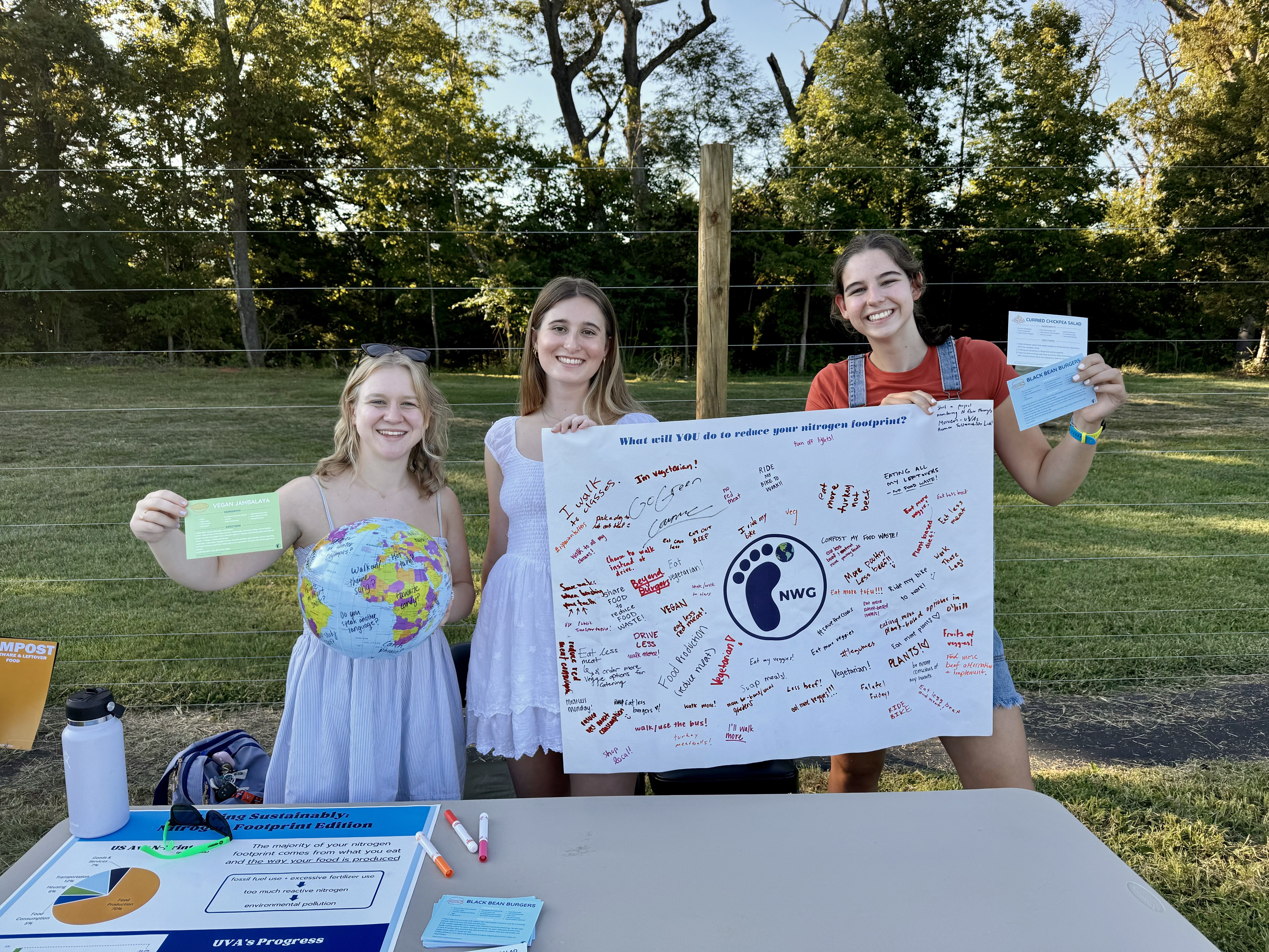 The Social Outreach team for the Nitrogen Working Group (NWG) is responsible for educating the University of Virginia community about reactive nitrogen, its environmental impacts, and the actions that can be taken at the university and individual level to reduce our footprints. Outreach is performed through a variety of means. First, we have an active presence on Instagram, where we post facts about nitrogen and other sustainability topics, as well as encourage students to reduce their environmental footprints. Follow us at @uvanitrogen!