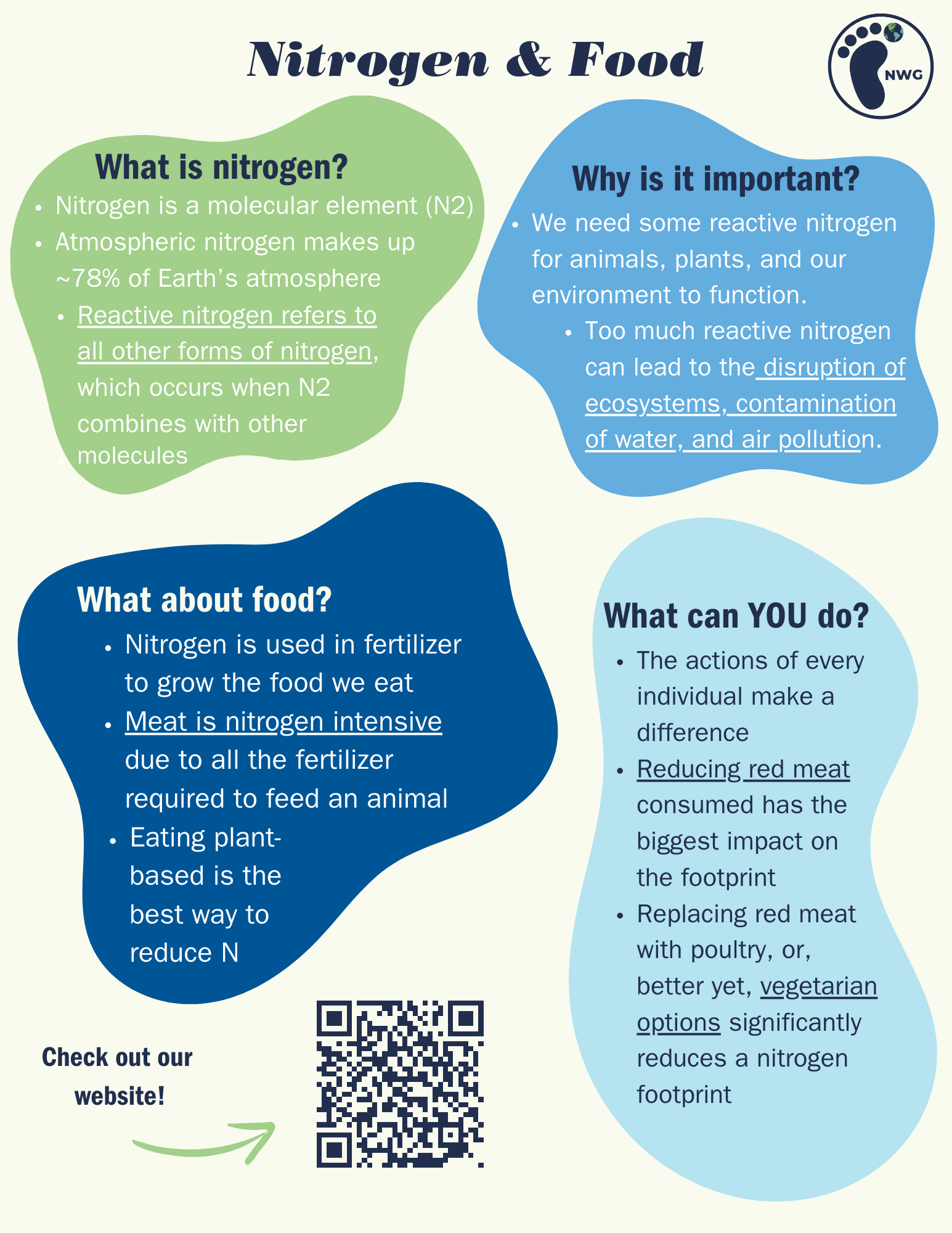 Another critical component of our mission is to educate on the impact of food on nitrogen footprints. We do this through extensive collaboration with UVA Dine, through whom the NWG Footprint Team receives its food data. You can check out more about our collaboration with UVA Dine here. We table with UVA Dine the first Thursday of every month when they host their Taste Cart, which is an initiative to encourage plant-forward eating by featuring yummy meals cooked with local ingredients. We also collaborate extensively with the chefs of the dining halls to offer students more plant-based meals without sacrificing the protein-rich foods that students need to maintain health. Check out a handout we made in conjunction with UVA Dine below: