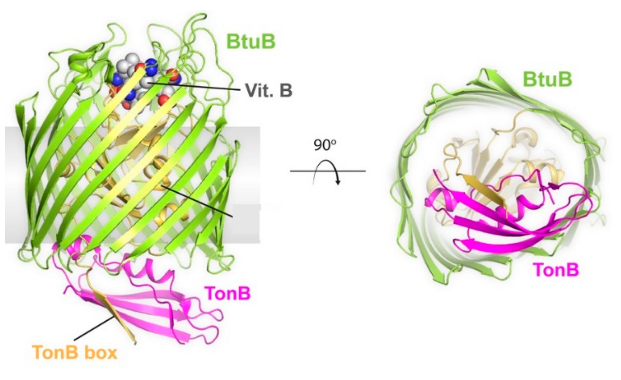 A recent development in the Cafiso lab allows for unpaired electrons, also known as spin labels, to be placed on BtuB in intact E. coli cells allowing for double electron-electron resonance (DEER) measurements to be taken in fully functional BtuB. Because both of these electrons have unpaired spin states, their magnetic dipole-dipole interactions can be observed during nutrient binding to measure the change in distance between the two labels, and gather information on the dynamics of the core of the protein during transport. Preliminary studies suggested that native, or unpurified, BtuB exhibits structural changes within the core of the protein that have not been observed in purified BtuB. To probe this protein further, two electron labels were placed on BtuB, one on a fixed extracellular location and the other within the core of BtuB. Researchers found that a charge-based interaction between the core of the protein and the outer barrel was broken upon binding to transport molecules, allowing for core domain amino acid residues to extend towards the periplasmic space and subsequent transport of the nutrient into the bacterial cell. This research highlights the importance of studying proteins in their native cellular environment and revealed a mechanism of transport that was not previously hypothesized.