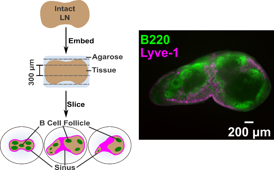 A key aspect to understanding immune responses from vaccines, infectious diseases, cancer, or autoimmunity is to study responses in the lymph node. Lymph node structures are complex with at least three distinct regions that communicate with each other in order to produce an immune response. This communication can occur through direct physical contact between cells or indirectly through chemical signals, indicating a relationship between the structure of the lymph node to the immune response that it produces. Typically, studies are limited to the imaging of live tissues (in vivo) or the culturing of lymphoid cells (in vitro). In vitro cell cultures allow for the lymphatic cells to be studied during an immune response, but the importance of the structure of the organ is lost. In vivo imaging studies allow for the structural properties of the lymph node to be retained, but it is difficult to visualize and analyze all the processes occurring in a live organ.