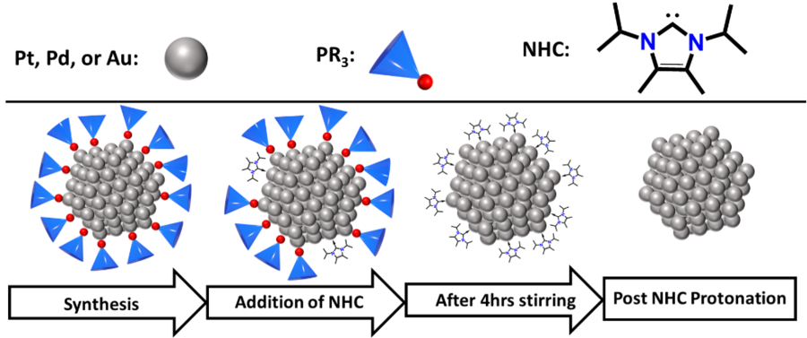 In collaboration, Drs. Sen Zhang and Robert Gilliard and coworkers have developed a surfactant removal method that utilizes N-heterocyclic carbenes (NHC). In this two-step process, trioctylphosphine (TOP) surfactants on platinum, palladium, and gold NC surfaces were first exchanged with NHC ligands. Then, surface bound NHCs were reacted with concentrated acid and were subsequently removed from the NC surface to expose the NC active sites. These surfactant-free NCs demonstrated improved catalysis toward reactions that are important to the development of alternative energy applications. This new strategy of surfactant removal to expose NC surface active sites will improve the ability for NCs to be used in not only catalysis but other relevant applications, such as alternative energy and biomedical sensing technologies.