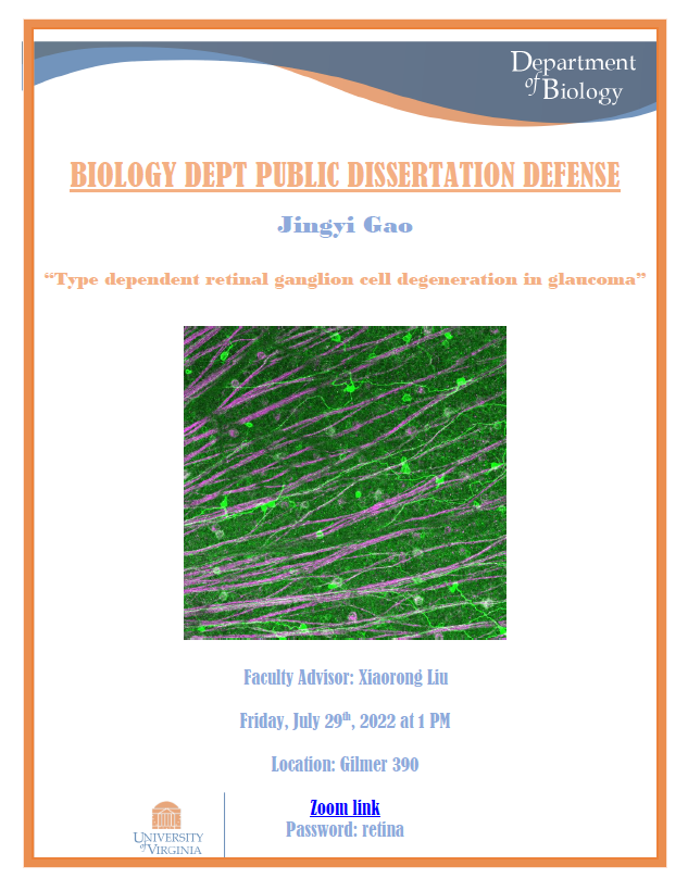 March 2023, Xiaorong received the 4-VA at UVA Collaborative Research Grant. She will collaborate with Dr. Arina Korneva in the Department of Biomedical Engineering and Mechanics at the Virginia Tech on a proposed project investigating axonal transport defects in glaucoma.